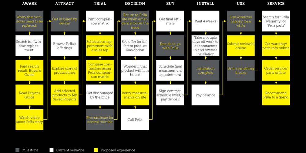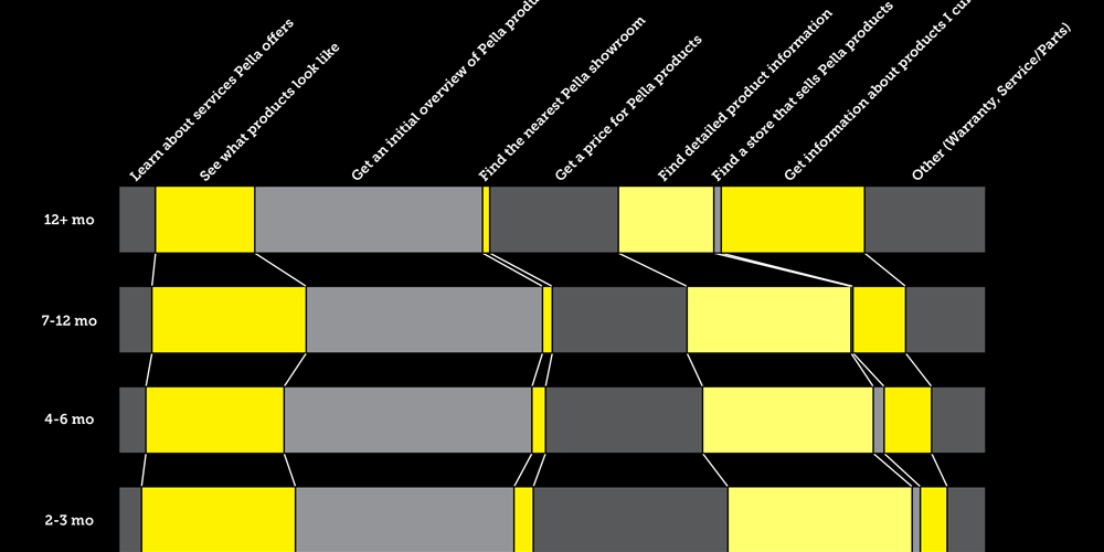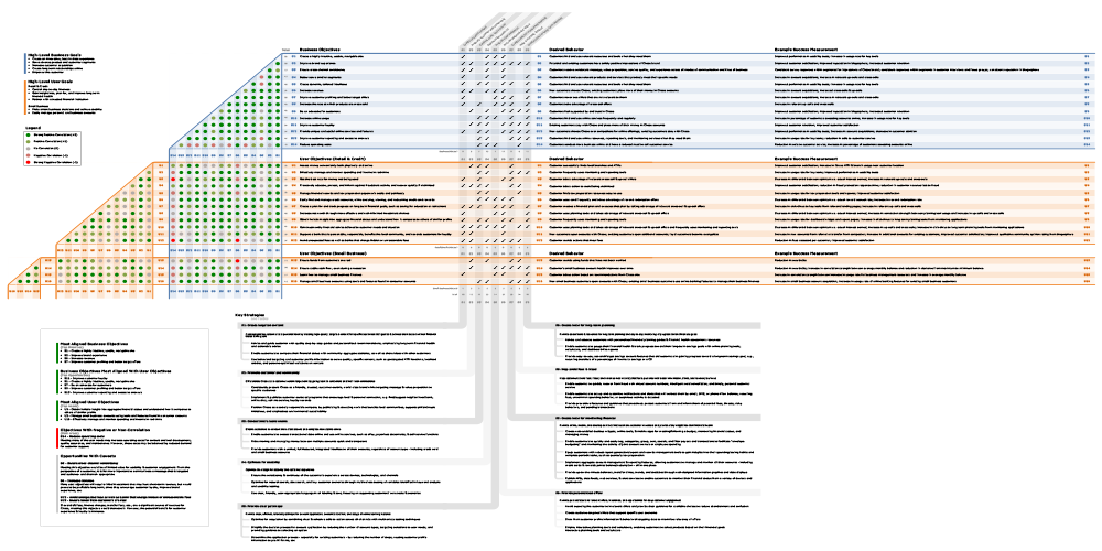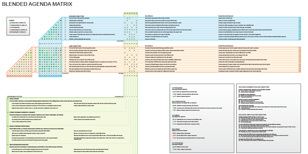 Blended agenda matrix, synthesizing user and stakeholder interviews into a strategic map comparing objectives of customers and business.