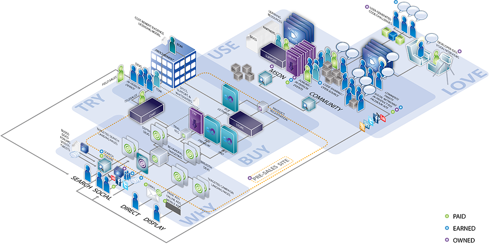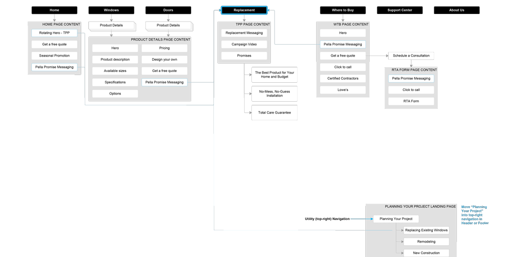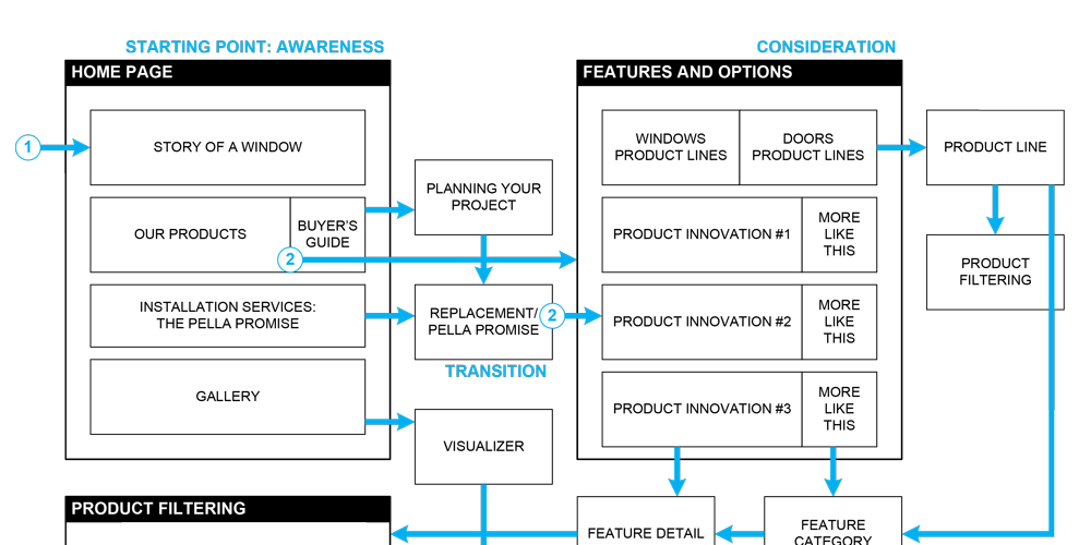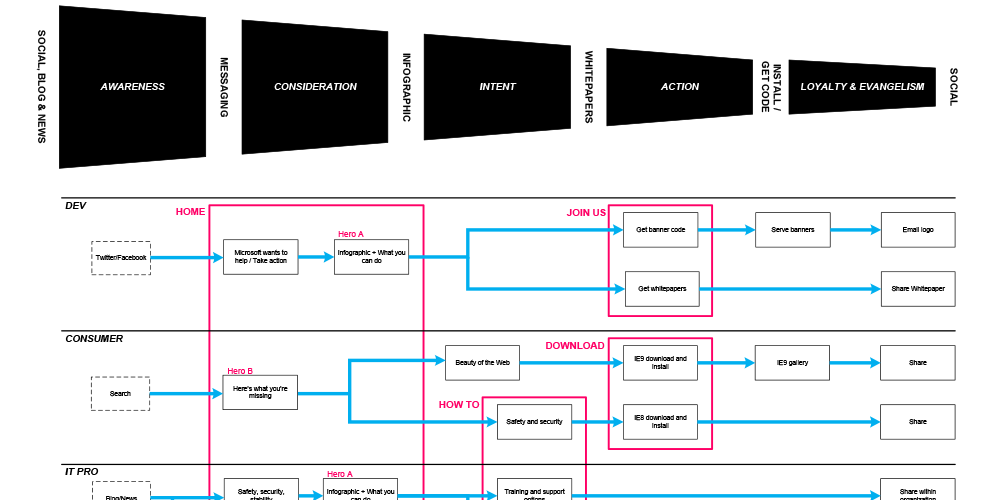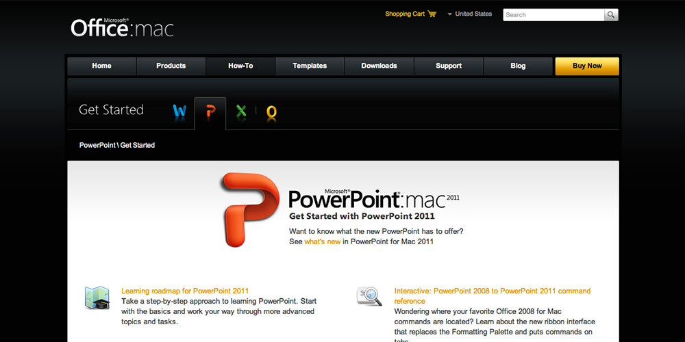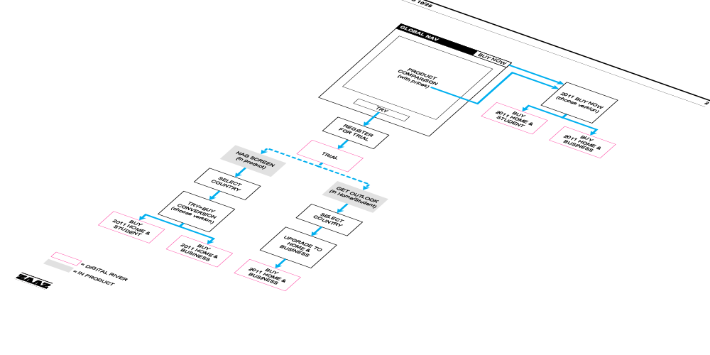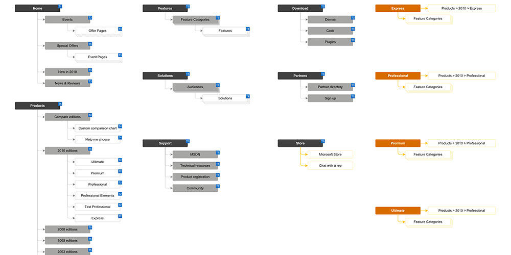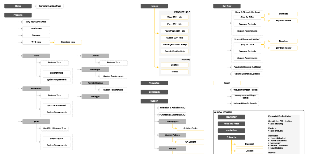 Site map of the redesigned Office for Mac site, aligning each product to a common structure and creating cross-site paths to related content.