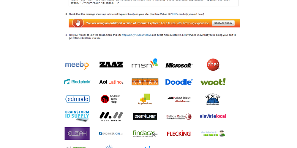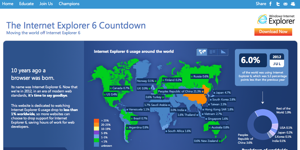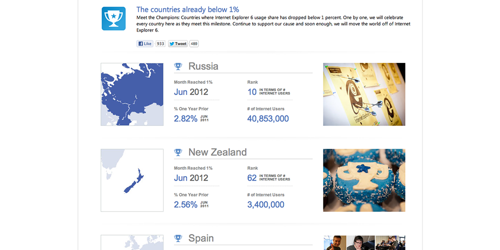 As new countries see their IE6 use drop below 1%, they are celebrated here. Project details >